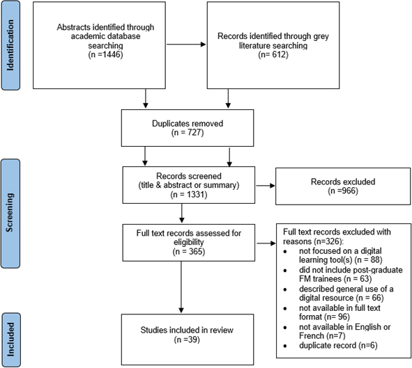 The full search strategy is described in detail in our protocol.6 Briefly, the major search terms were “family medicine training” and “digital learning tools.” For “digital learning tools,” we searched both database-specific subject headings (eg, computer-assisted instruction, mobile applications, simulation training, virtual reality, social media) and a wide range of related keywords (eg, digital learning, elearning, gamification, web-based, smartphone, tablet, Twitter). For “family medicine training”, we used only keywords, which included combinations of terms related to family medicine (eg, family medic*, primary care, general practi*) and training (eg, educat*, residen*, post?graduate*, student*, train*). We searched MEDLINE, ERIC, Education Source, and Embase using subject heading terms and keywords. Scopus and Web of Science do not use subject headings, so we searched these using keywords alone. We also searched the reference lists of the included articles. The results of the academic literature searches were imported into Covidence (Covidence Inc) software for deduplication and title/abstract screening. The academic literature search was conducted in August 2021 and updated in August 2022.