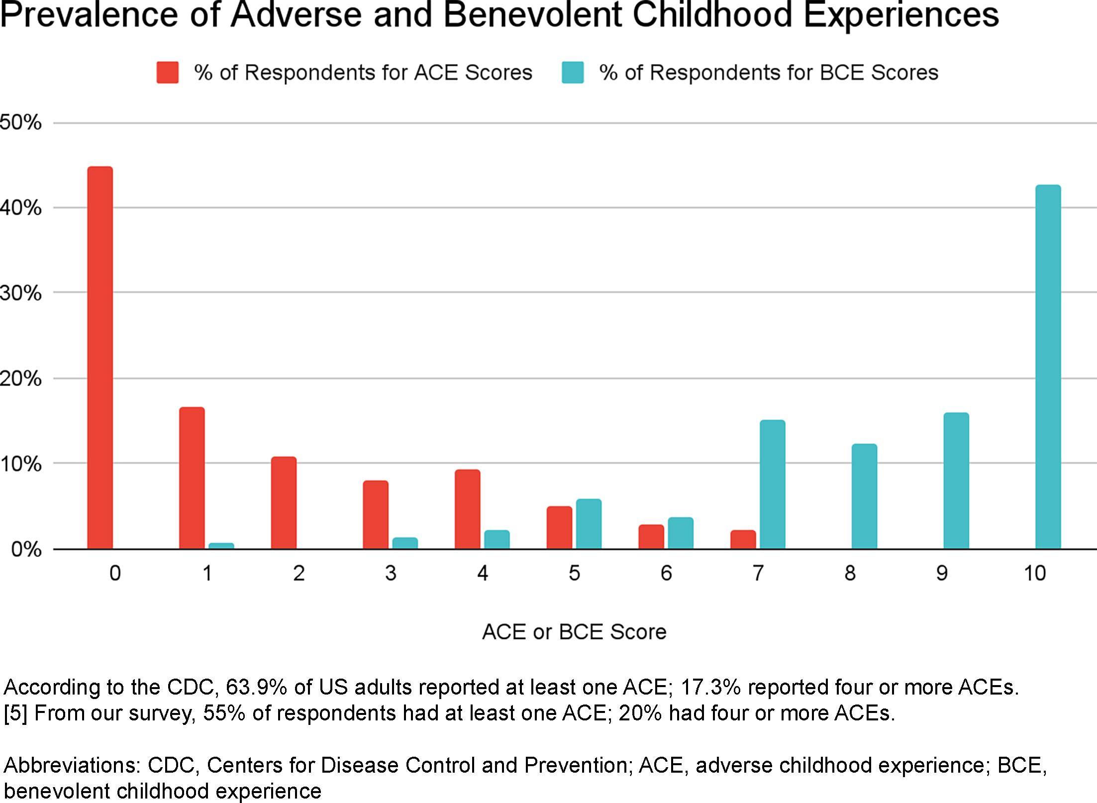 Additionally, 20% of respondents, like 17.3% of the general population, have four or more ACEs, predisposing them to several chronic conditions and unhealthy coping.1,5 One important consideration for ACEs is racially disadvantaged status. Though our study found no significant racial/ethnic differences, national data show unequal ACE exposure. Larger studies may better assess how ACEs, BCEs, and coping differ across disadvantaged groups.18
