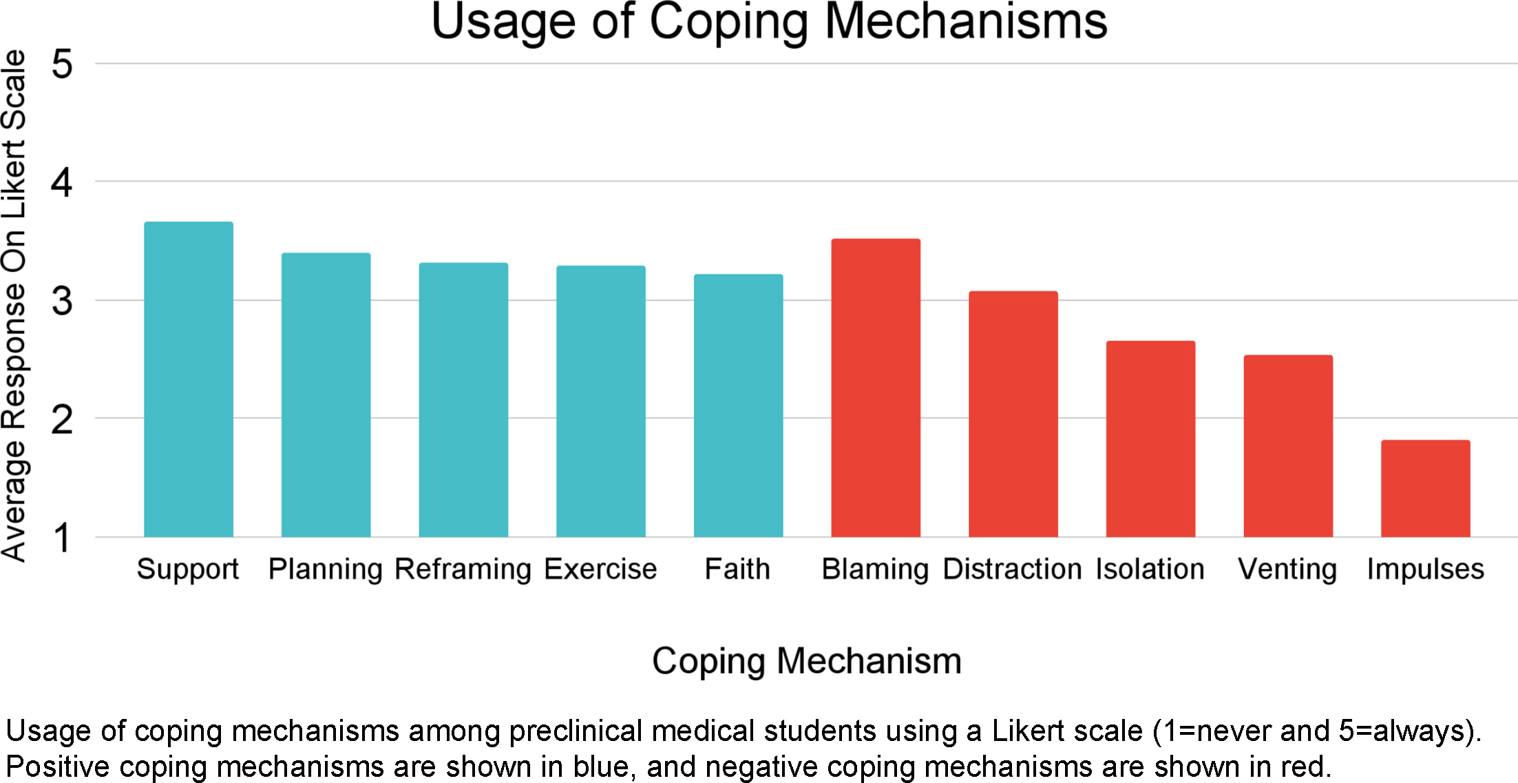 Limitations of this study included the nongeneralizable sample set, age of respondents (most under 35), disproportionately low responses from disadvantaged racial groups, subjectivity of question interpretation, and possible fatigue from the length of the full survey. Additionally, the prompt “What do you usually do when you experience a stressful event?” was accidentally omitted.