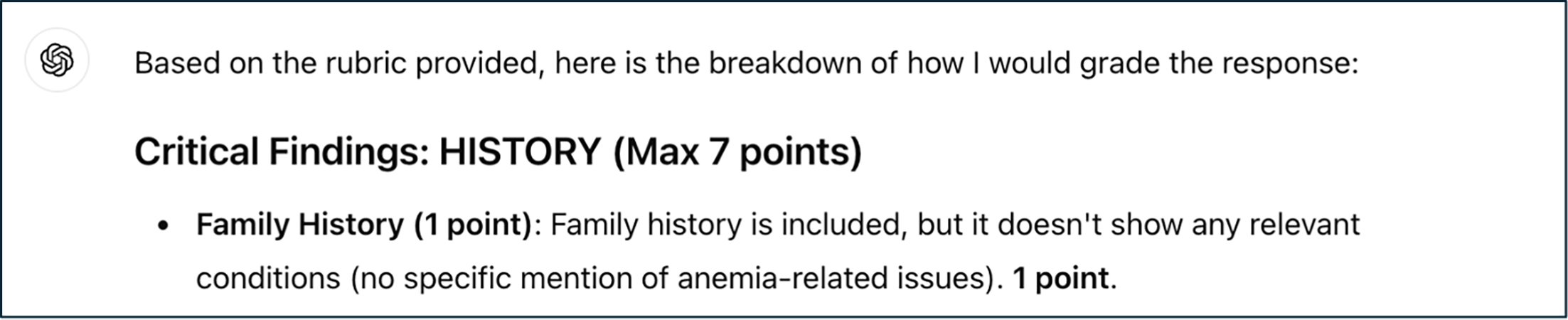 Despite prompting to “use the rubric” with each SOAP note, GPT frequently made its own assumptions about “reasonable” differential diagnoses and treatment plans, which were not explicitly outlined in the grading rubric. Diagnoses such as myasthenia gravis (Figure 1) were awarded points by GPT, despite not being mentioned overtly in the rubric (focal neurological deficits are not present in the patient script). GPT consistently awarded points for ordering lab tests that were not listed in the rubric. It also awarded points for vague tests such as “panel for blood disorders,” which a clinical proctor would not consider specific enough. While these errors are anecdotal, they support the notion that ChatGPT-4 cannot fully replace a human grader. Deviations from the grading rubric indicate that medical educators bring domain-specific depth and pedagogical insight to grading, which ChatGPT-4 lacks.