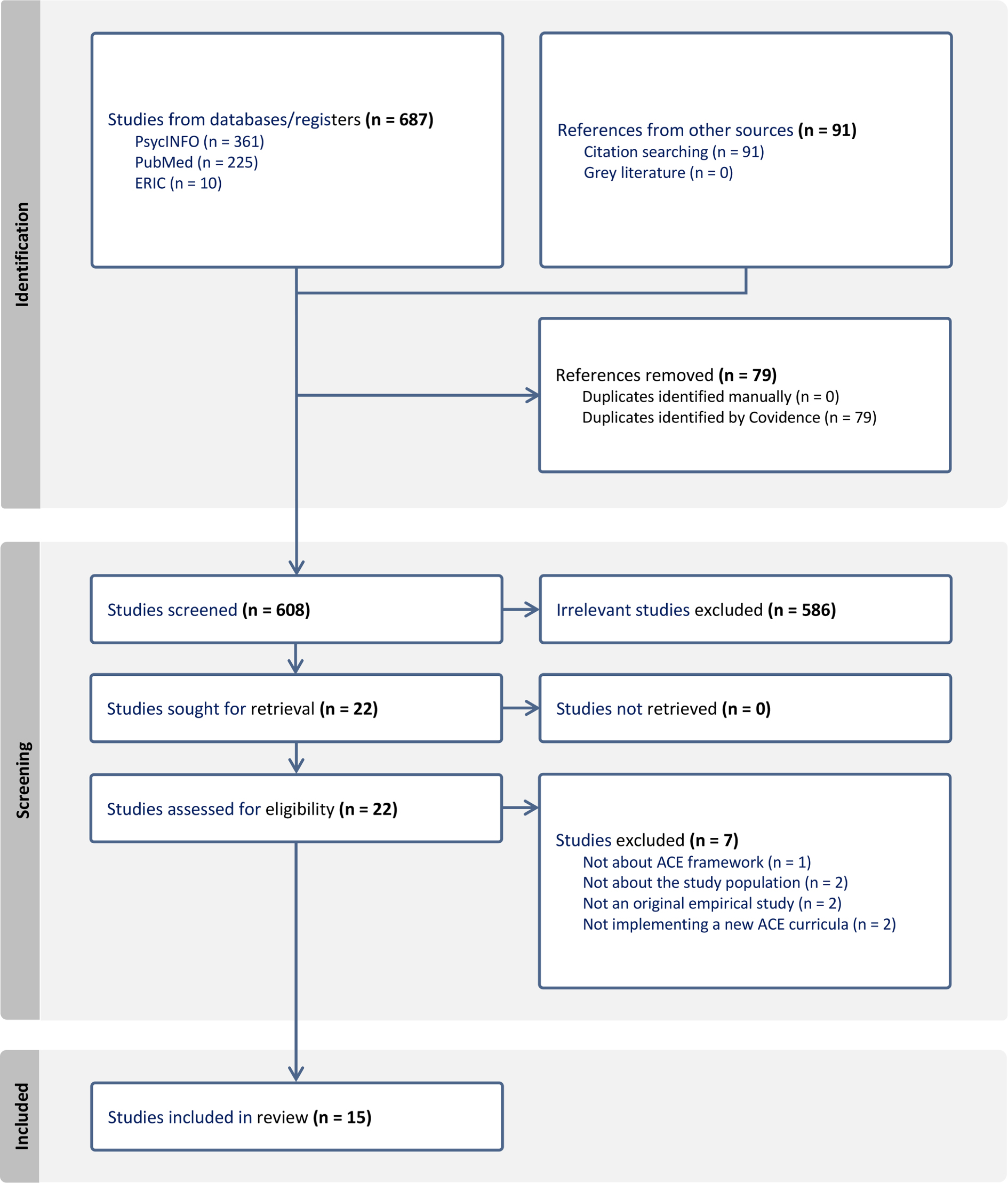 The database searches and citation chaining produced 687 articles. After deduplication, 608 unique studies were left to screen. Following a review of titles and abstracts, 586 studies were excluded, leaving 22 articles for full-text review. Of these, 15 met the inclusion criteria (Figure 1).