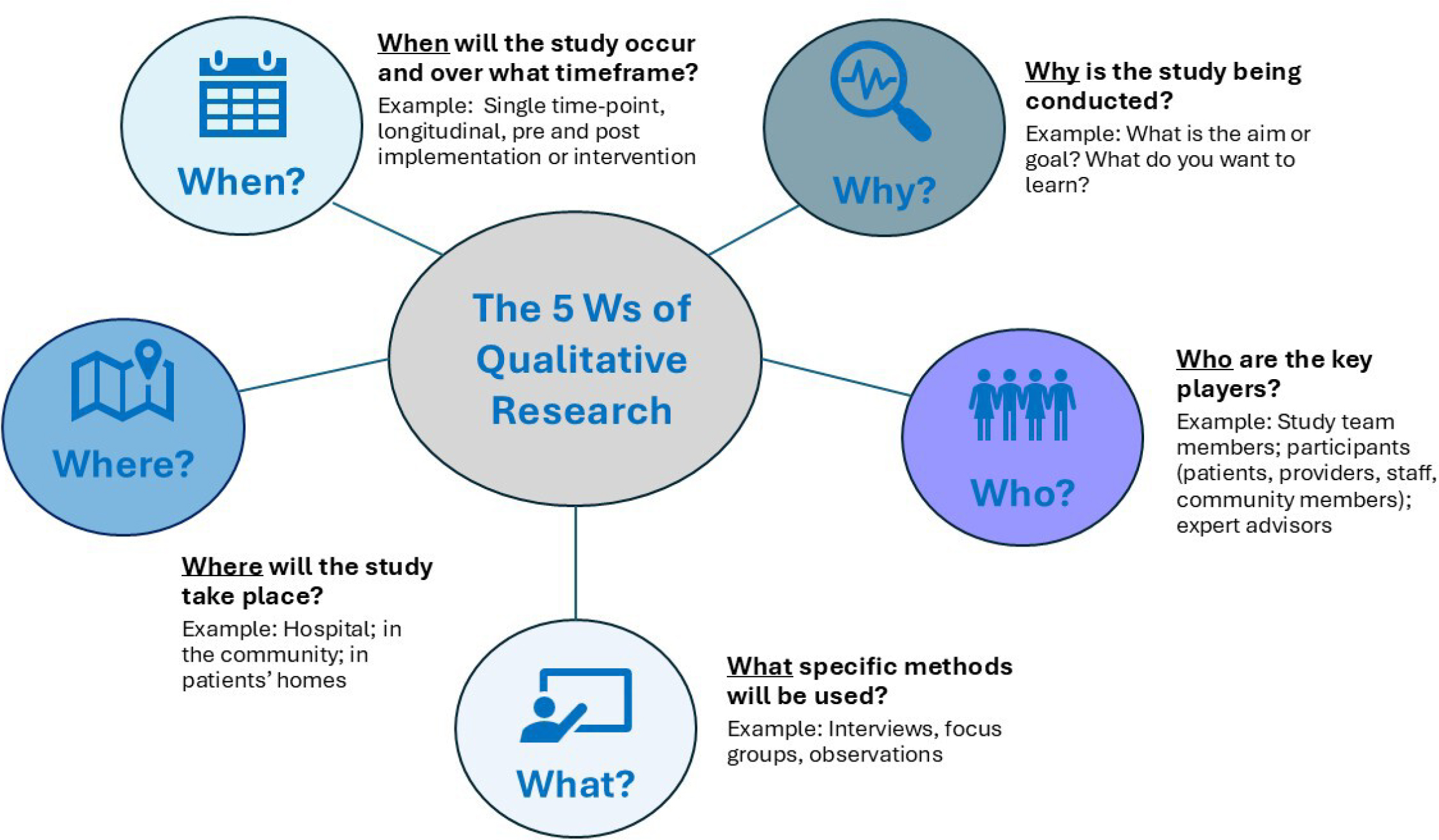 When designing a qualitative study, consider the five W’s of qualitative research (Figure 1).