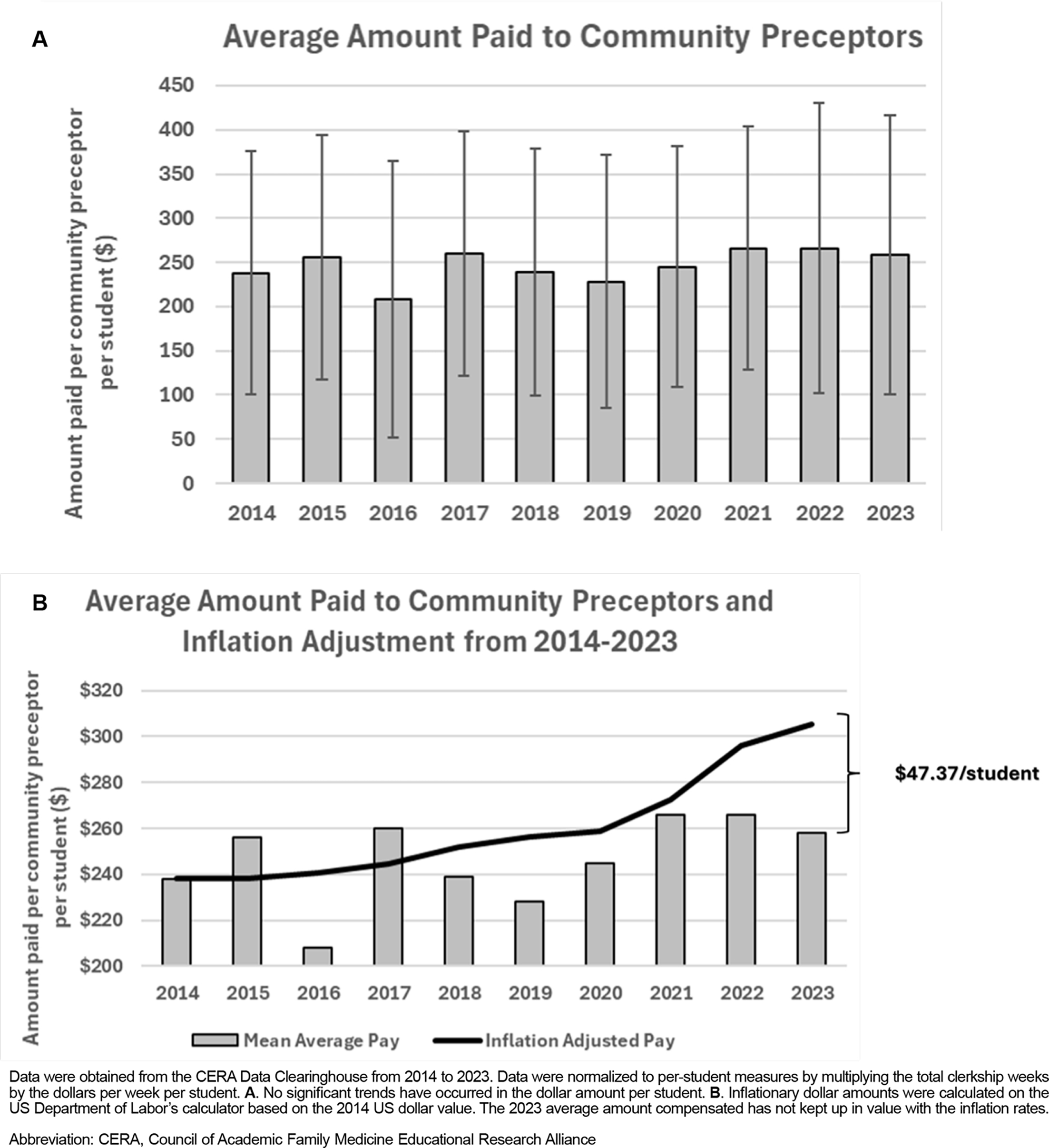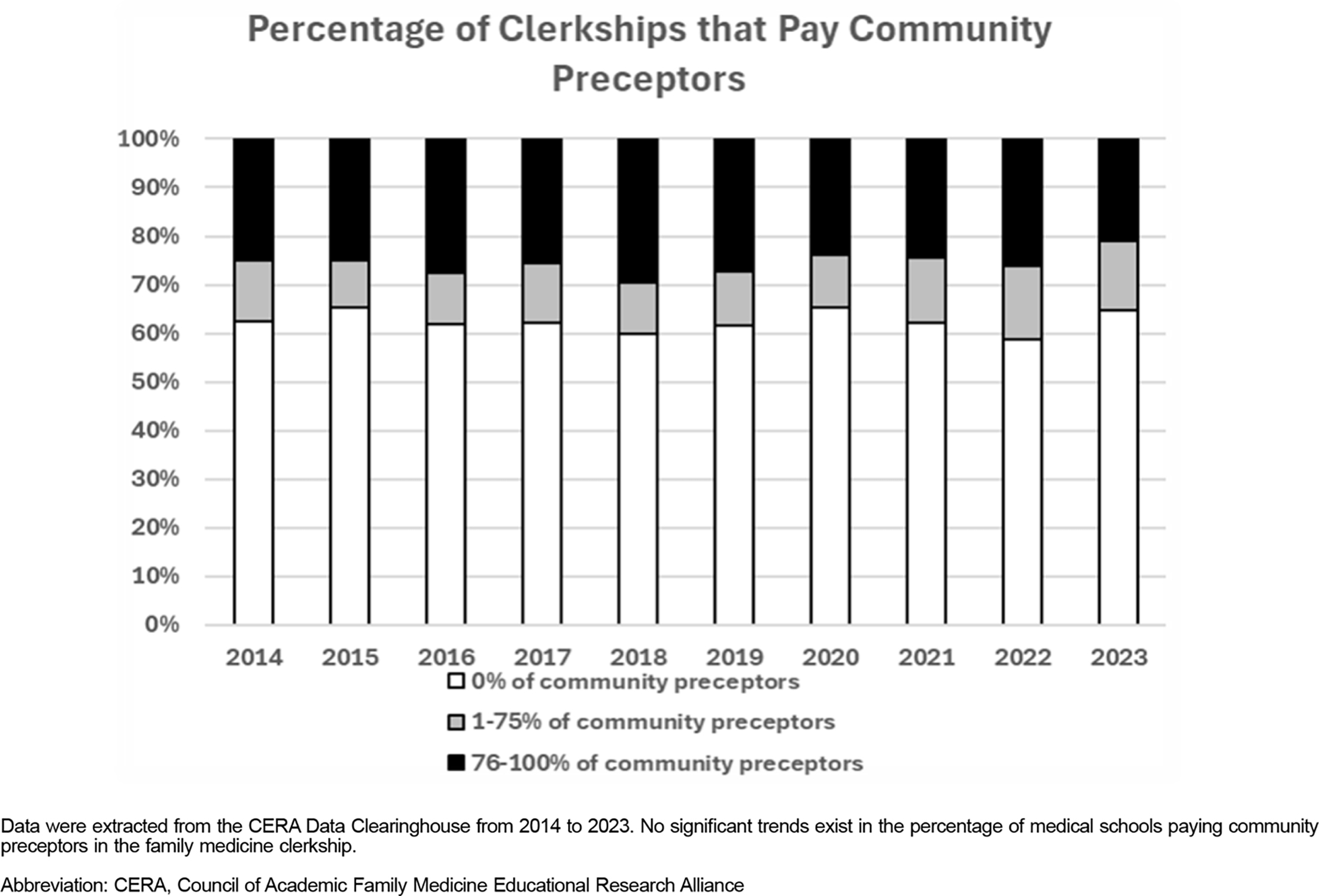Our study should be interpreted with the following limitations. The CERA data from 2014 to 2023 included variability in response rates from year to year and did not track which institutions completed the survey each time. Inability to track specific institutions from year to year would hide clerkships that newly compensated community preceptors, stopped paying community preceptors, or made changes to the compensation of community preceptors. Additionally, these data solely pertained to family medicine clerkship experiences and does not account for other interactions with family medicine community preceptors such as preclinical experiences. Furthermore, the data collected considered only monetary compensation and excluded other nonmonetary benefits provided by adjunct faculty status.