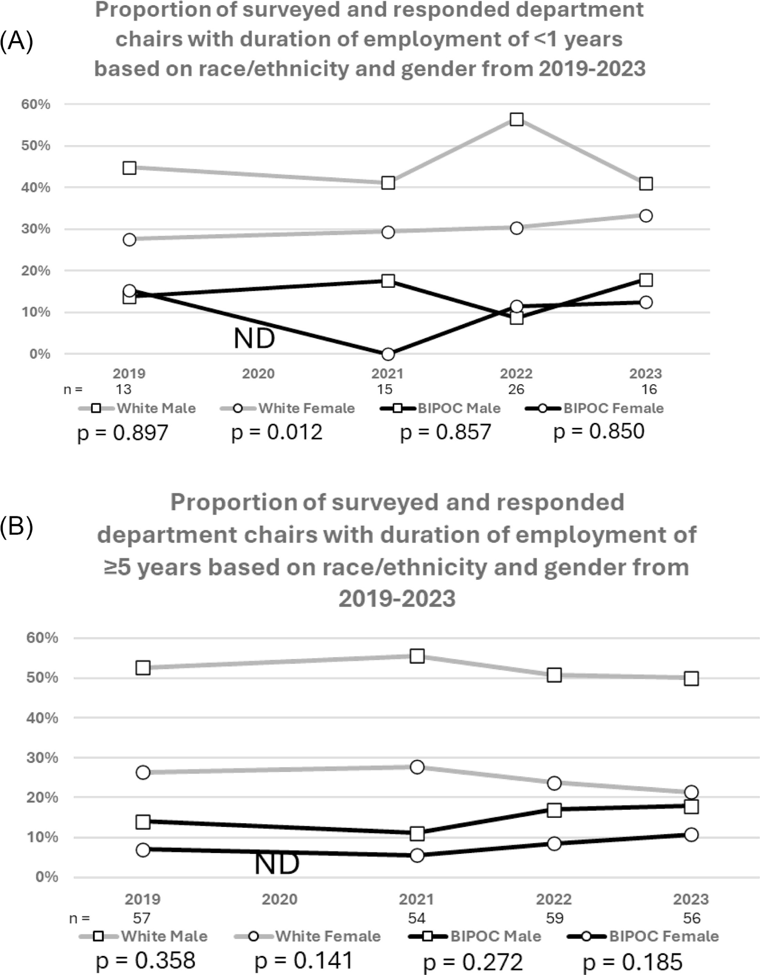 We did not observe significant changes among white male DCs with duration <1 year (Figure 3A). White female DCs with duration <1 year showed a significant decrease in representation, declining from 26.3% (15/57) in 201921.4% (12/46) in 2023 (R2 = 0.953, P=0.012). We did not identify significant trends among white male or female DCs with duration ≥5 years (Figure 3B), nor among BIPOC male or female DCs with duration <1 year and duration ≥5 years.