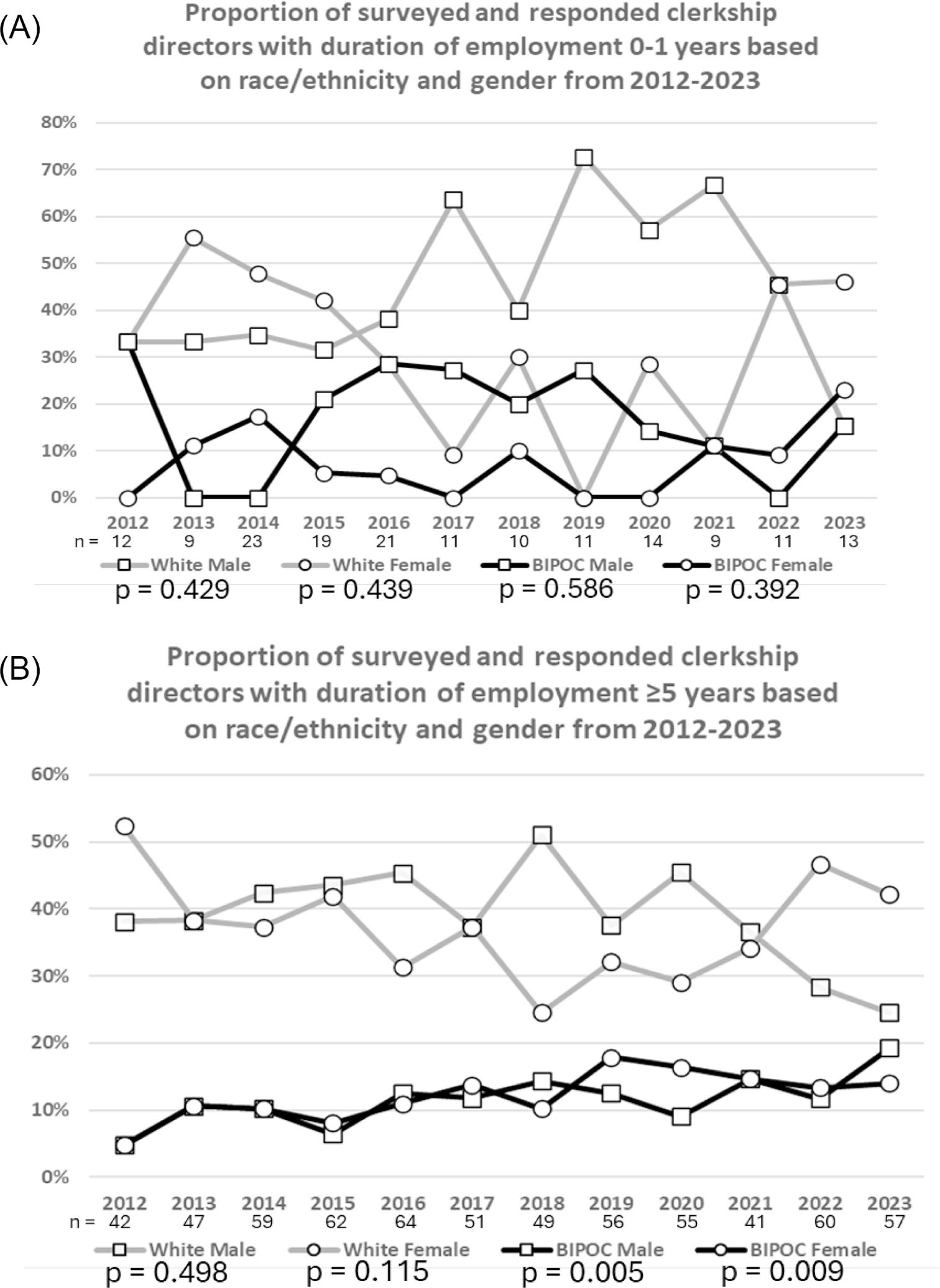 Results: Increases in BIPOC representation were observed only among leaders with ≥5 years of duration. Increases in the proportion of BIPOC male and female clerkship directors with ≥5 years rose from 4.8% each in 2012 to 19.3% and 14.0% in 2023 (P=0.005, P=0.009). BIPOC female program directors with ≥5 years of duration increased from 4.4% in 2018 to 17.3% in 2023 (P=0.001). No significant trends were identified among department chairs or among leaders with <1 year of duration.