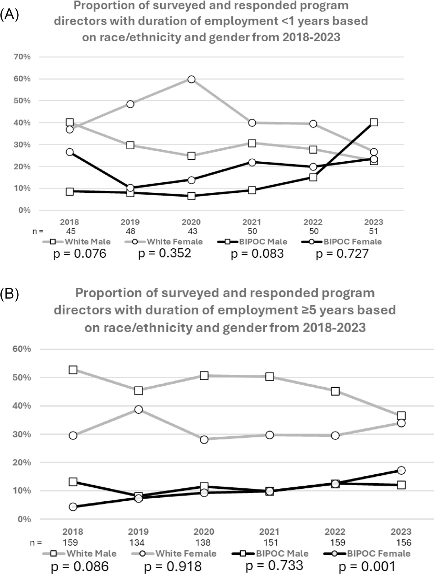 We did not detect significant trends among white male and white female PDs with duration <1 year (Figure 2A) nor duration ≥5 years (Figure 2B). We did not observe significant trends among BIPOC male and female PDs with duration <1 year. We found no significant trends for BIPOC male PDs with duration ≥5 years, however, BIPOC female PDs with duration ≥5 years showed a significant increase in representation, rising from 4.4% (7/159) in 2018 to 17.3% (27/156) in 2023 (R2 = 0.942, P=0.001).
