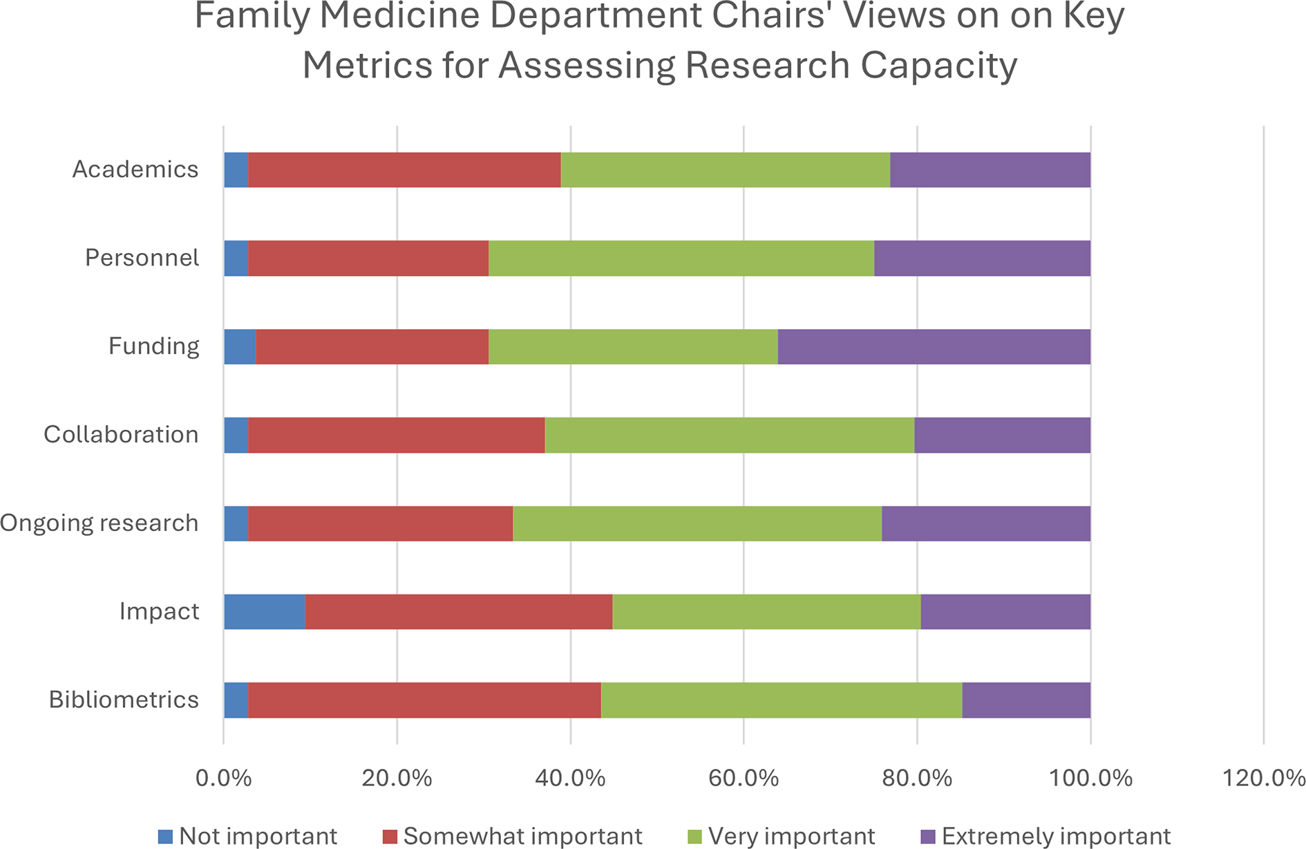 Conclusions: Funding emerged as the category of research metrics viewed as most important by the greatest number of family medicine department chairs. Although other categories of metrics also were viewed as important, this survey demonstrated no clear pattern of their relative importance in this population.