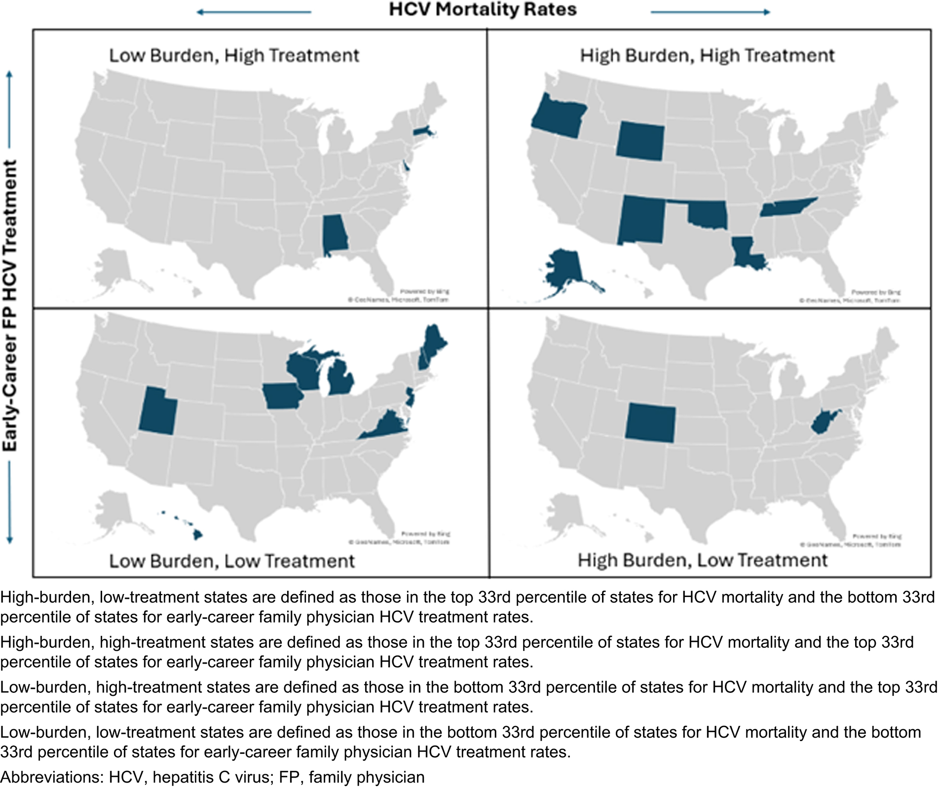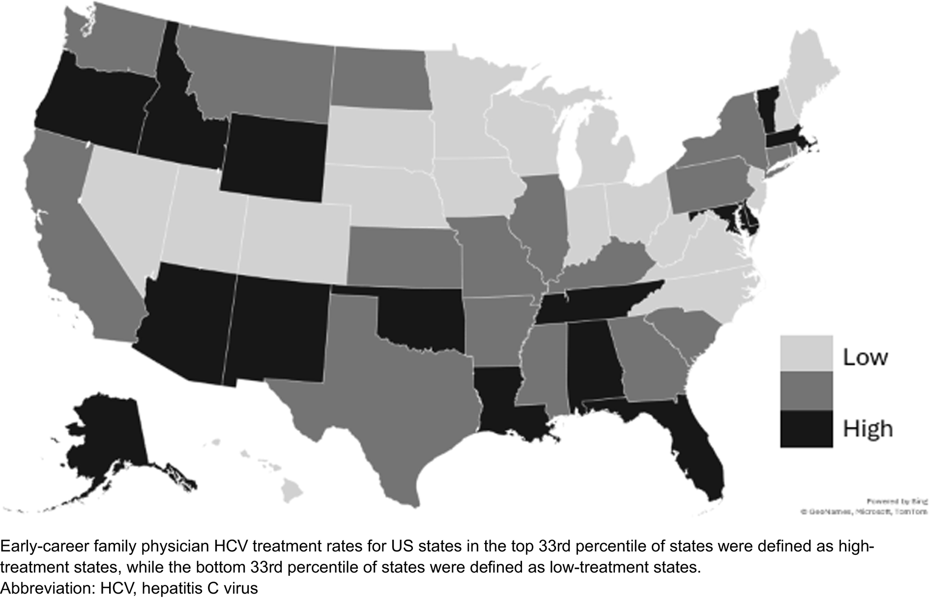 Methods: We merged 2016–2023 data from the American Board of Family Medicine National Graduate Survey, which is administered 3 years after completing residency, with state-level HCV mortality data from the Centers for Disease Control and Prevention (2017–2021). We conducted bivariate analyses to examine differences in HCV treatment by physician characteristics, practice type, and practice location. We created maps to visually explore HCV treatment and mortality by state.