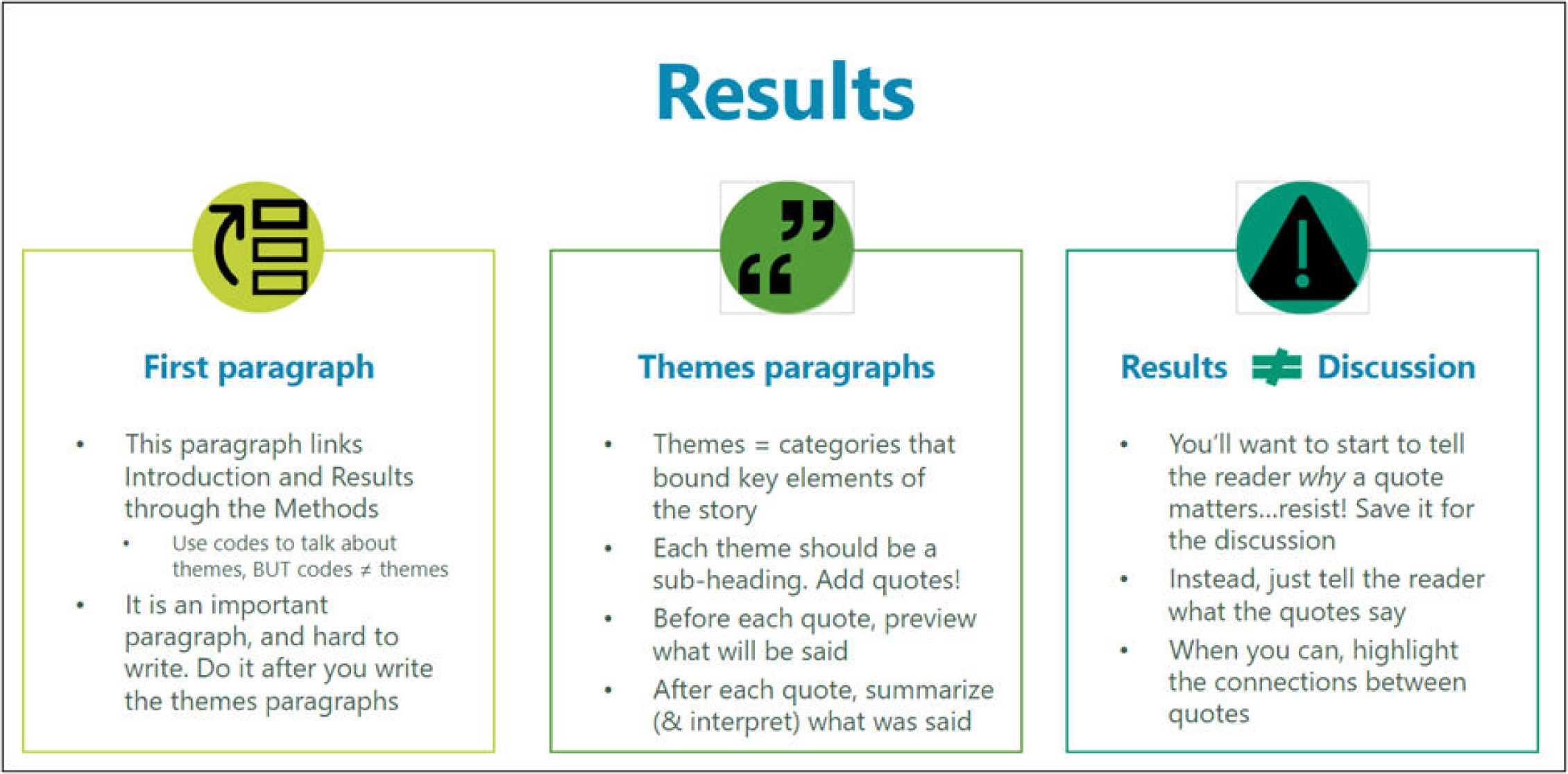 Medical and health services journals tend to have a uniform structure: introduction/background, methods, results/findings, discussion/conclusions.12 The introduction/background introduces the topic and includes (a) a description of what is known about the topic, (b) where there are gaps in knowledge, and (c) how this research addresses one or more of those gaps. For the methods section, qualitative checklists can provide guidance on what to include. The consolidated criteria for reporting qualitative studies (COREQ)13 and standards for reporting qualitative research (SRQR)14 are commonly used. However, not all aspects of these checklists are appropriate to every article. The results/findings section follows the methods. It presents the results of the authors’ analysis and usually includes three to four takeaways that characterize themes or topics or narrative threads, along with data (eg, quotes) that provide evidence that illustrates the themes (Figure 1).