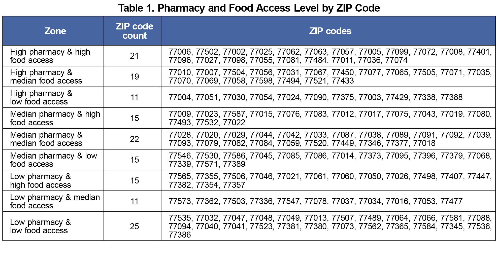 Table 1 shows the distribution of ZIP codes across all pharmacy and food access categories. The count of ZIP codes that fall into each access level combination varied, from 25 ZIP codes in the low pharmacy–low food access category to 21 ZIP codes in the high pharmacy–high food access category. Sixteen percent of the 154 ZIP codes were in areas with low pharmacy and low food access, 33% had at least low pharmacy access, and 33% were classified as low food access areas.