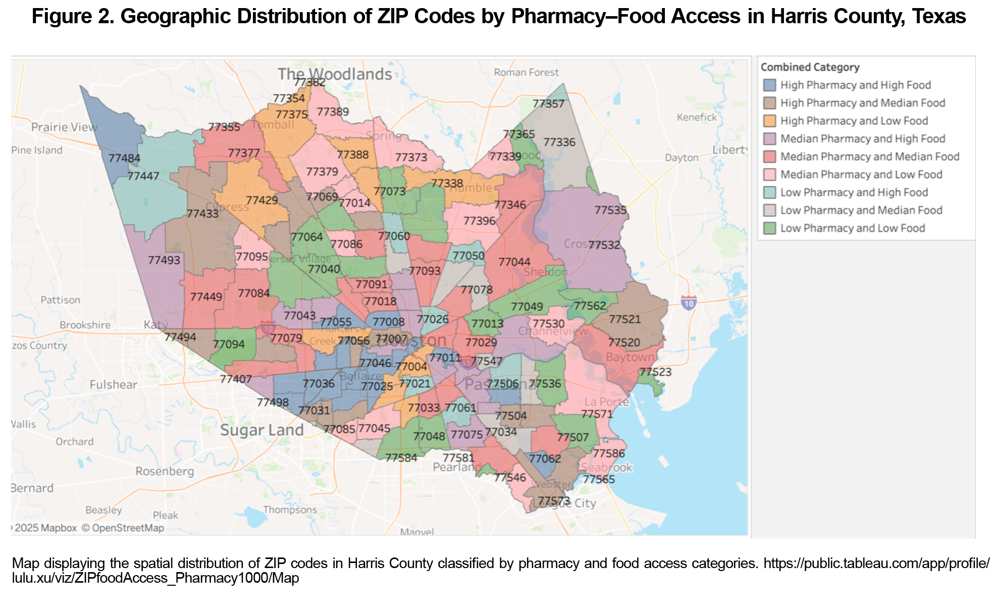 Results: Overall, approximately one-third of all ZIP codes exhibited low pharmacy access, and another third demonstrated low food access. About 20% of ZIP codes experienced both low pharmacy and low food access. As the pharmacy access increased, food access also increased, suggesting that ZIP codes with greater pharmacy access tend to have disproportionately higher food access, consistent with an exponential-type relationship. Low pharmacy and food access were predominantly in ZIP codes with higher poverty rates and diversity.