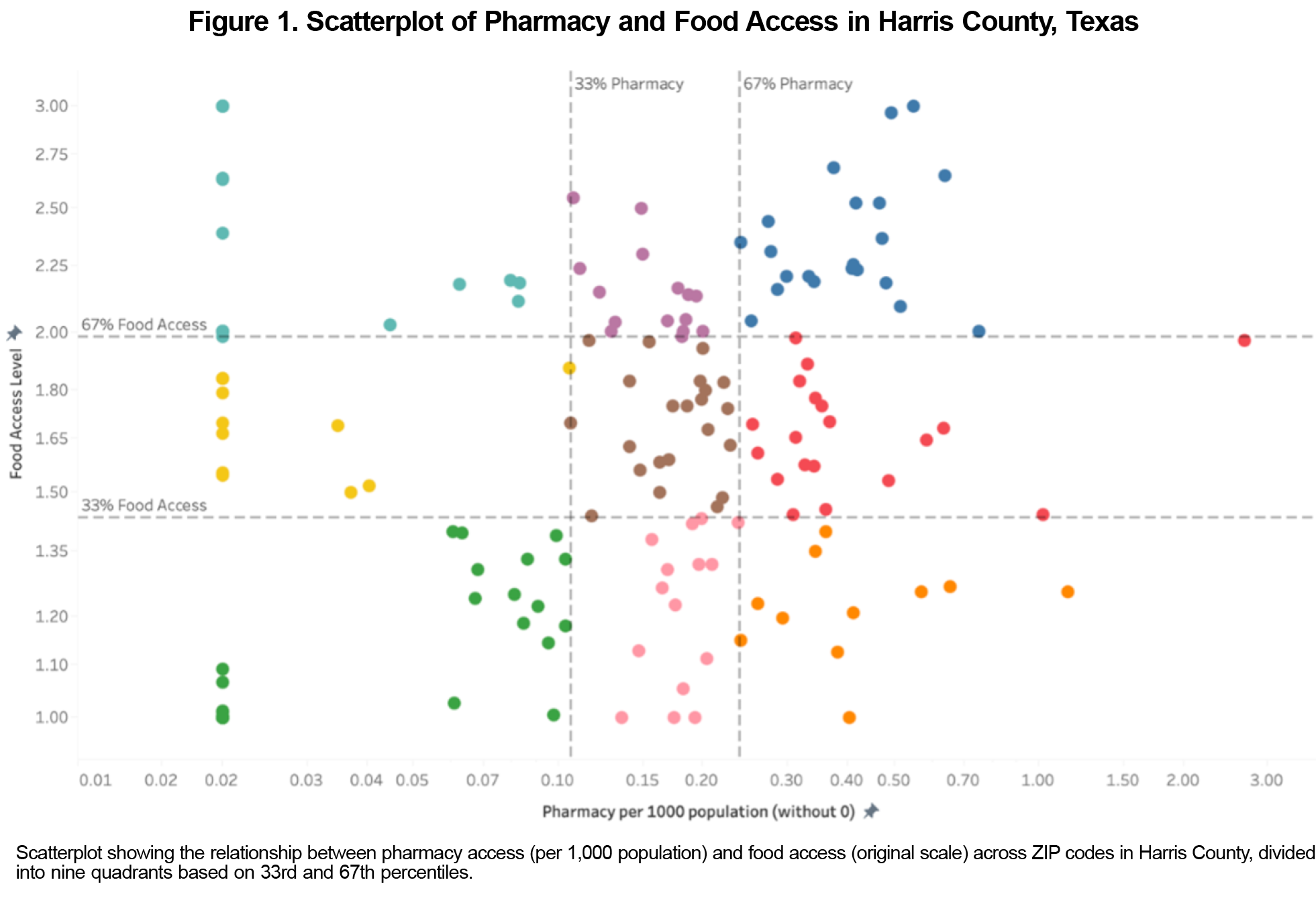 To visualize the relationship between pharmacy access and food access across different ZIP codes, we created a scatterplot using Tableau (Salesforce) software. The transformed values of pharmacies per 1,000 population and food access were used as the x and y coordinates, respectively. The scatterplot was divided into nine parts based on the 33rd and 67th percentile values of both variables. Each part represented a different combination of high, median, and low pharmacy and food access levels. Because the points in the original scatterplot overlapped heavily, making patterns difficult to distinguish, a log scale transformation was applied to pharmacy access per 1,000 population. This transformation reduced skewness and improved separation of points, allowing clearer visualization of the relationship.