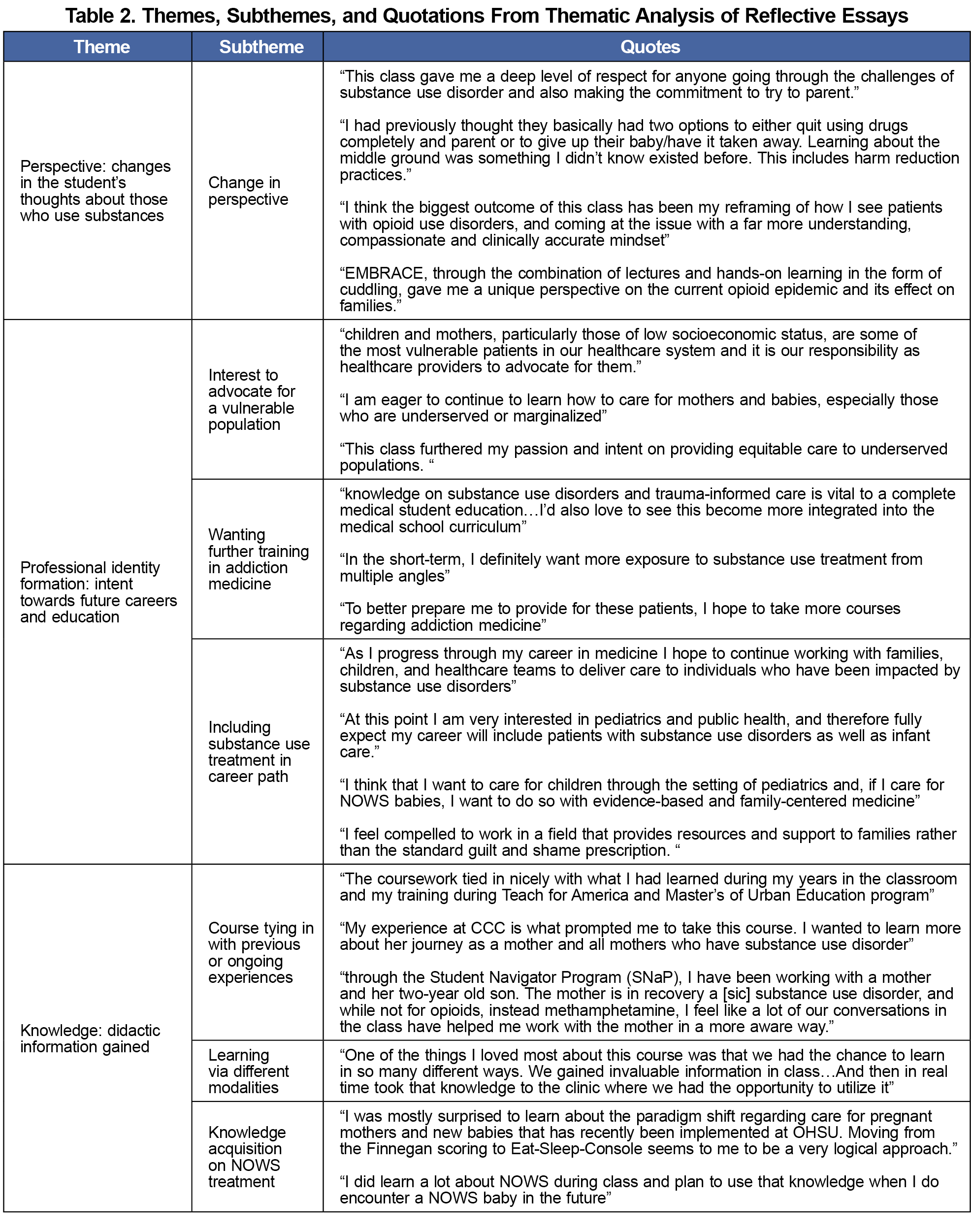 The students who enrolled in the EMBRACE elective were self-selected, often with pre-existing interest in newborn care and/or SUD. This limitation was accounted for by measuring the change in the pre- and postsurveys instead of the raw numbers. The DDPPQ was adapted and lost validity from prior use but was more applicable to students. While the course was pass/no-pass, the reflective essays were a required component of the course which may have influenced responses. The small class size limited the power of our research, but should serve as early data for future, larger studies. Given the limitations of self-assessment of knowledge and communication, future research should include objective evaluation such as observed clinical encounters.