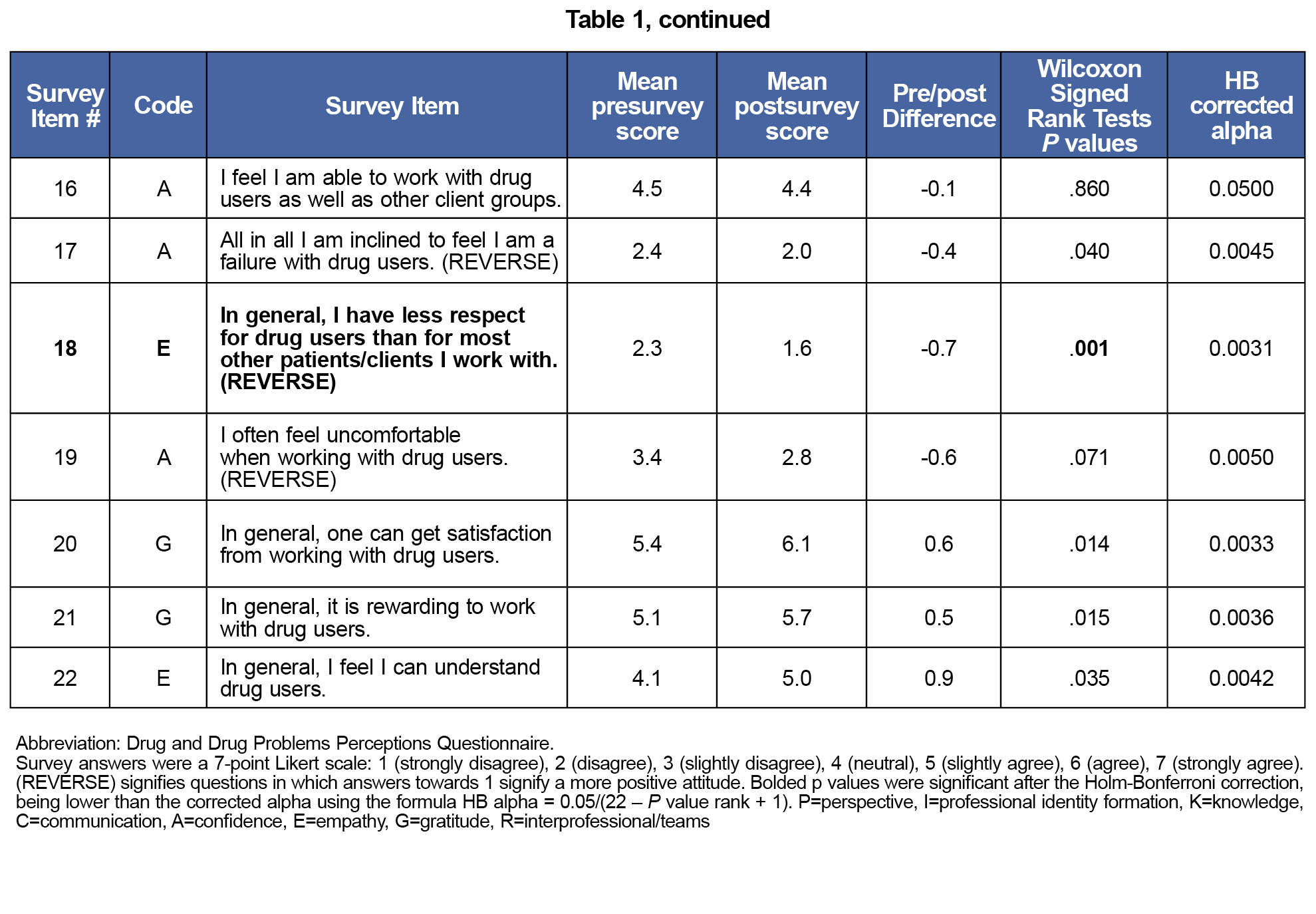 After obtaining institutional review board exemption, we conducted a mixed methods analysis for the first two cohorts (n=20). At their first and last course sessions, students filled out a survey (Table 1), adapted from the validated Drug and Drug Problems Perceptions Questionnaire (DDPPQ). The 20-item Likert scale questionnaire was designed to measure attitudes of professionals who work with people who use substances.17 Three questions were removed and five were added on student career goal intent to fit the scope of the elective (see Appendix 1). We analyzed responses through a Wilcoxon signed rank test using a Holm-Bonferroni correction for multiple comparisons.