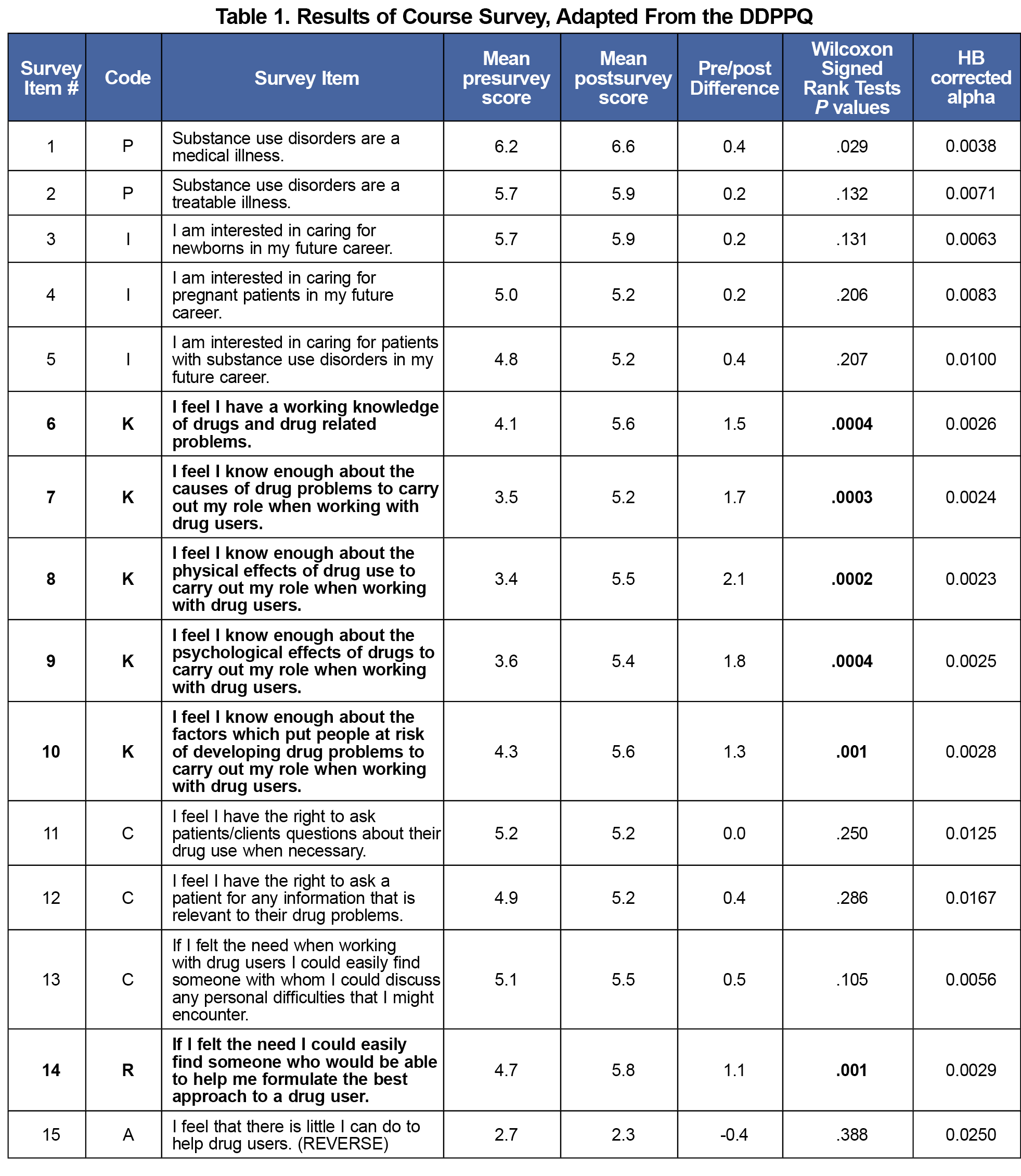 Methods: Enrolled preclinical medical students completed a pre- and postcourse survey, an adapted 22 question version of the Drug and Drug Problems Perceptions Questionnaire (DDPPQ). We analyzed results through a Wilcoxon signed ranked test and we performed a thematic analysis on students’ reflective essays.