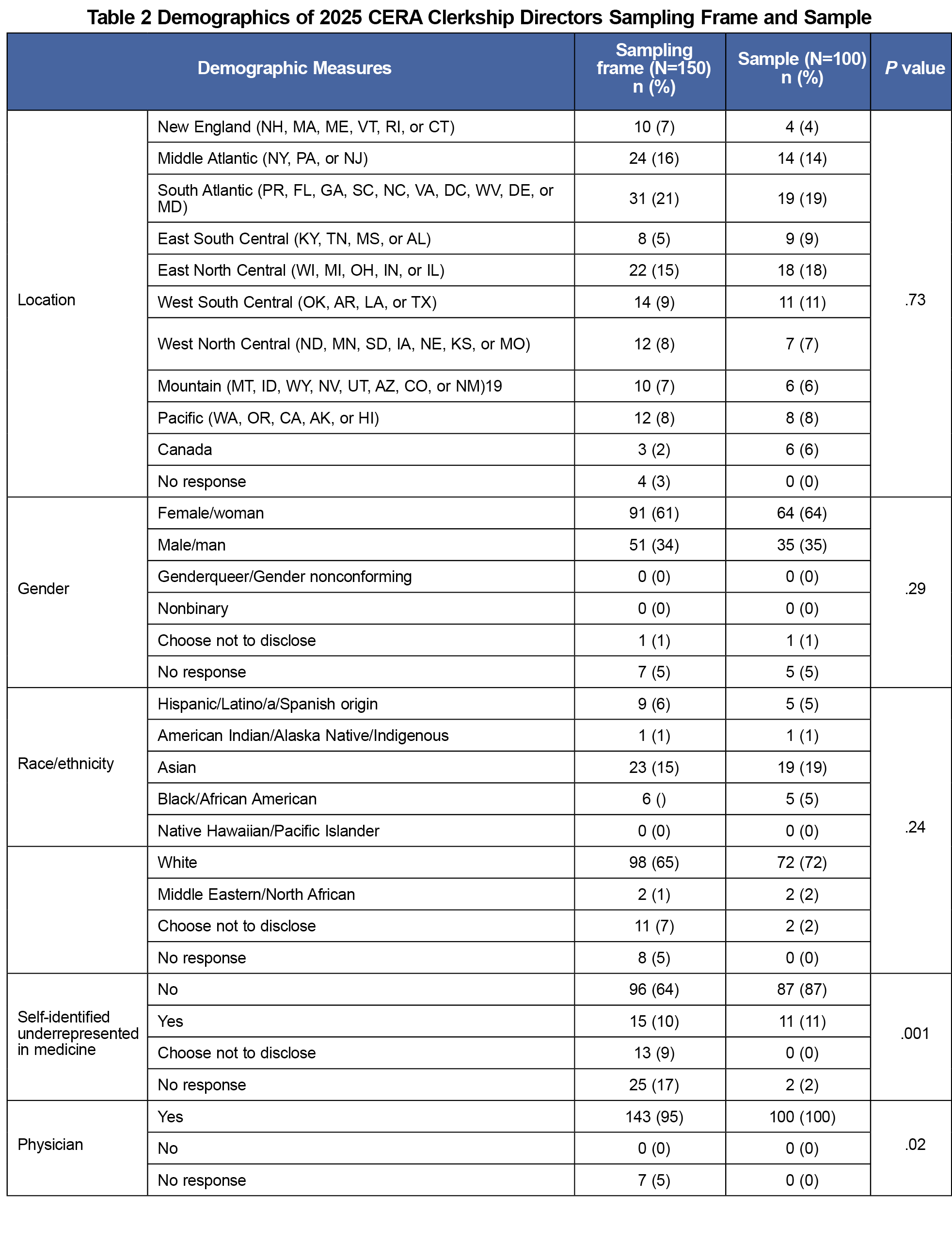 Table 1 lists accepted topics for the 2025 CD Survey. Two topics address clinical documentation by medical students. One hundred-four surveys were returned. Three respondents only answered the initial question, "Are you the clerkship director?" and were counted as nonresponses. Of the recipients who indicated they were not the CD, one did so on the final day the survey was open and this was counted as a nonresponse since the there was no time for the replacement CD to complete the survey. Therefore, 100 surveys had complete data, for an overall response rate of 57.47% (100/174). There were no significant differences between the proportions of geographic location, gender, or race/ethnicity in the sampling frame and the sample. There were differences in the proportions of URIM status (P=.001) and physician (P=.02) holder between the sampling frame and the sample (Table 2).
