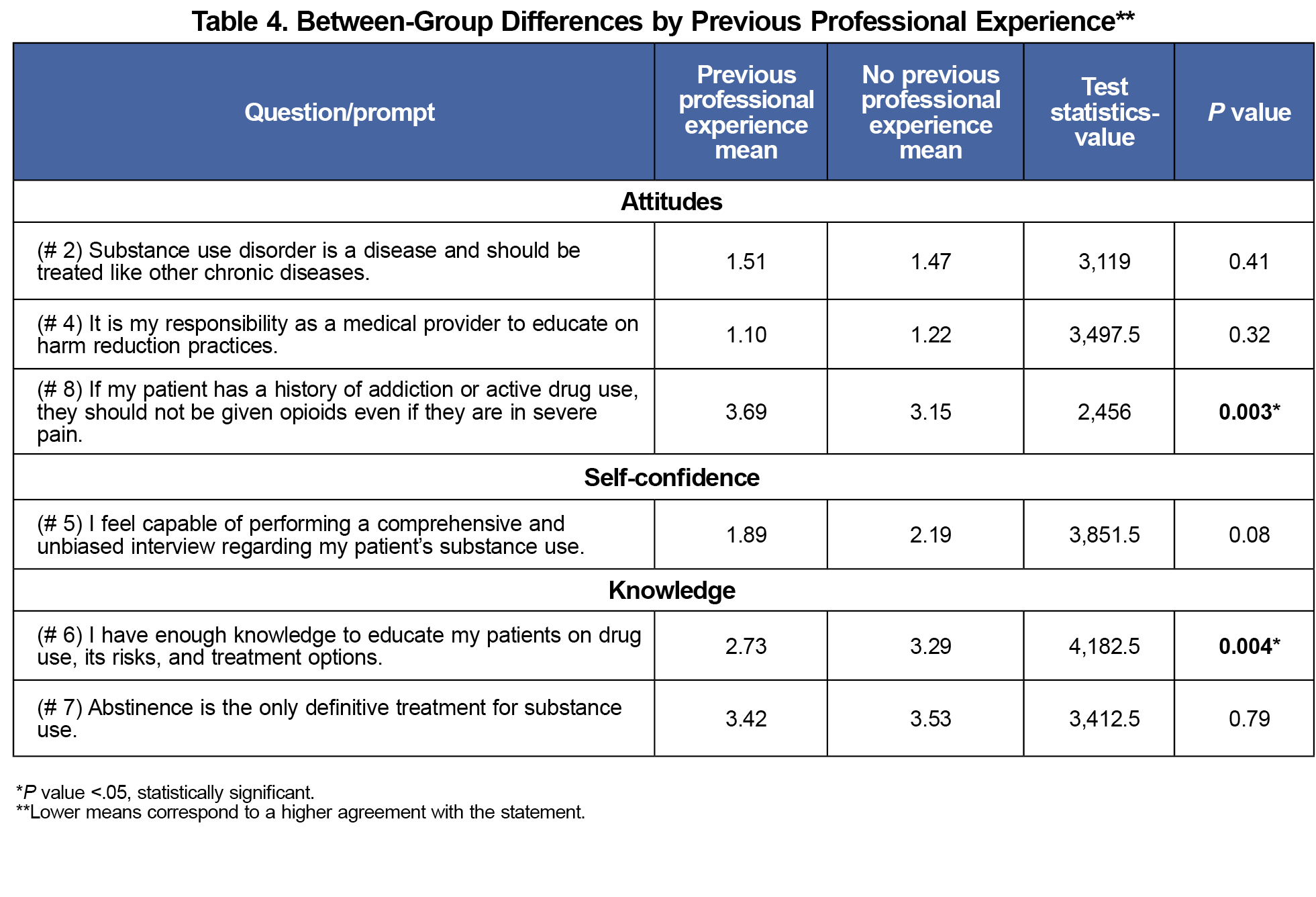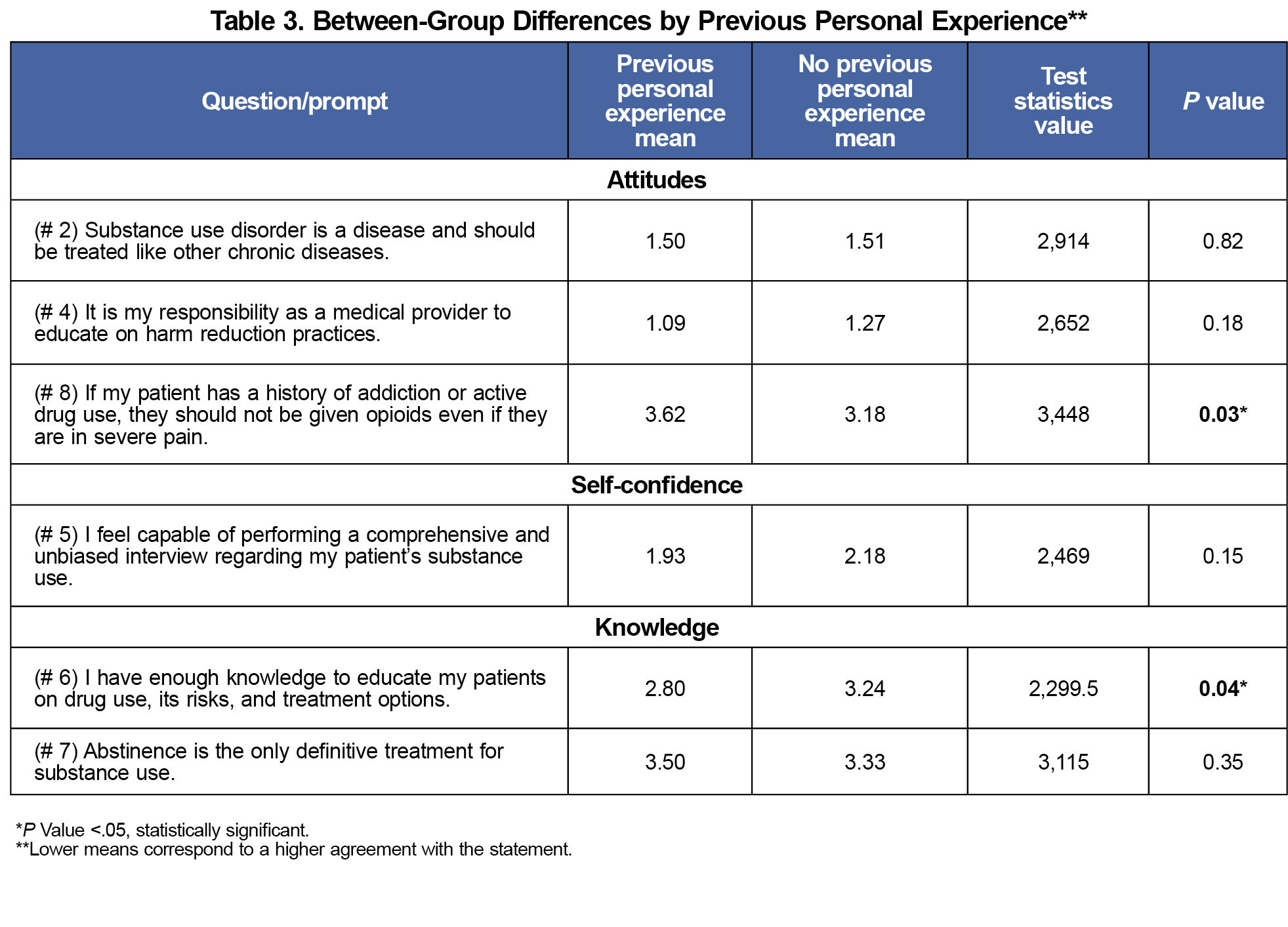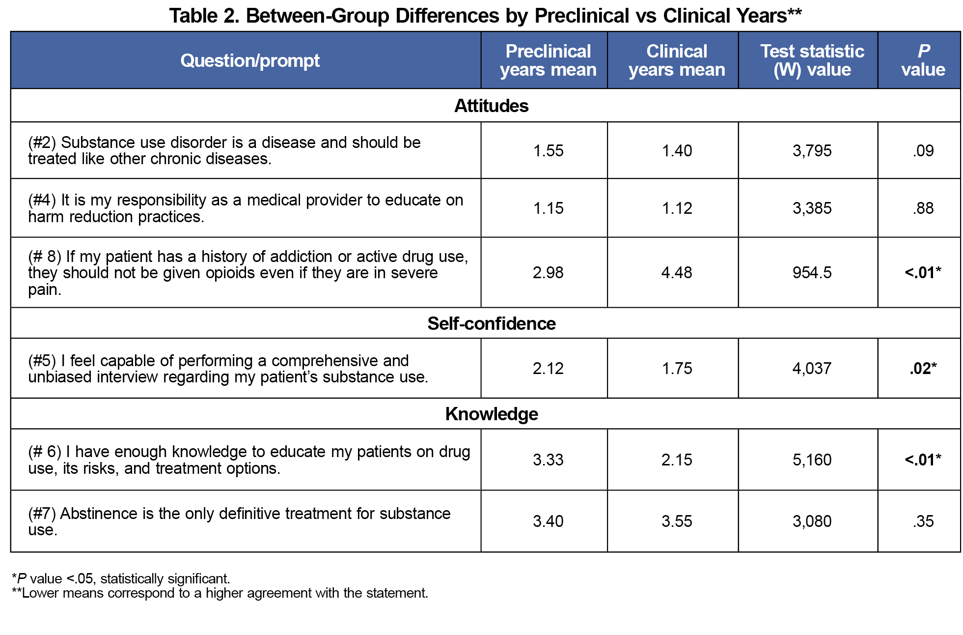 For the primary outcome, over 90% reported positive attitudes (Appendix 1: statements 2 and 4) for statements that legitimized SUD as a chronic disease and acknowledged a provider's responsibility to endorse harm reduction. However, only approximately half (55%) of students responded positively regarding opioid use for pain control in active users. Preclinical medical students had significantly more negative attitudes (W=955, P<.01, Table 2). Those with previous personal experience with PWUD had more positive attitudes regarding opioid use for pain control (W= 3448, P=.03) as well as those with previous professional experience compared to those without (W= 2456, P=.003).