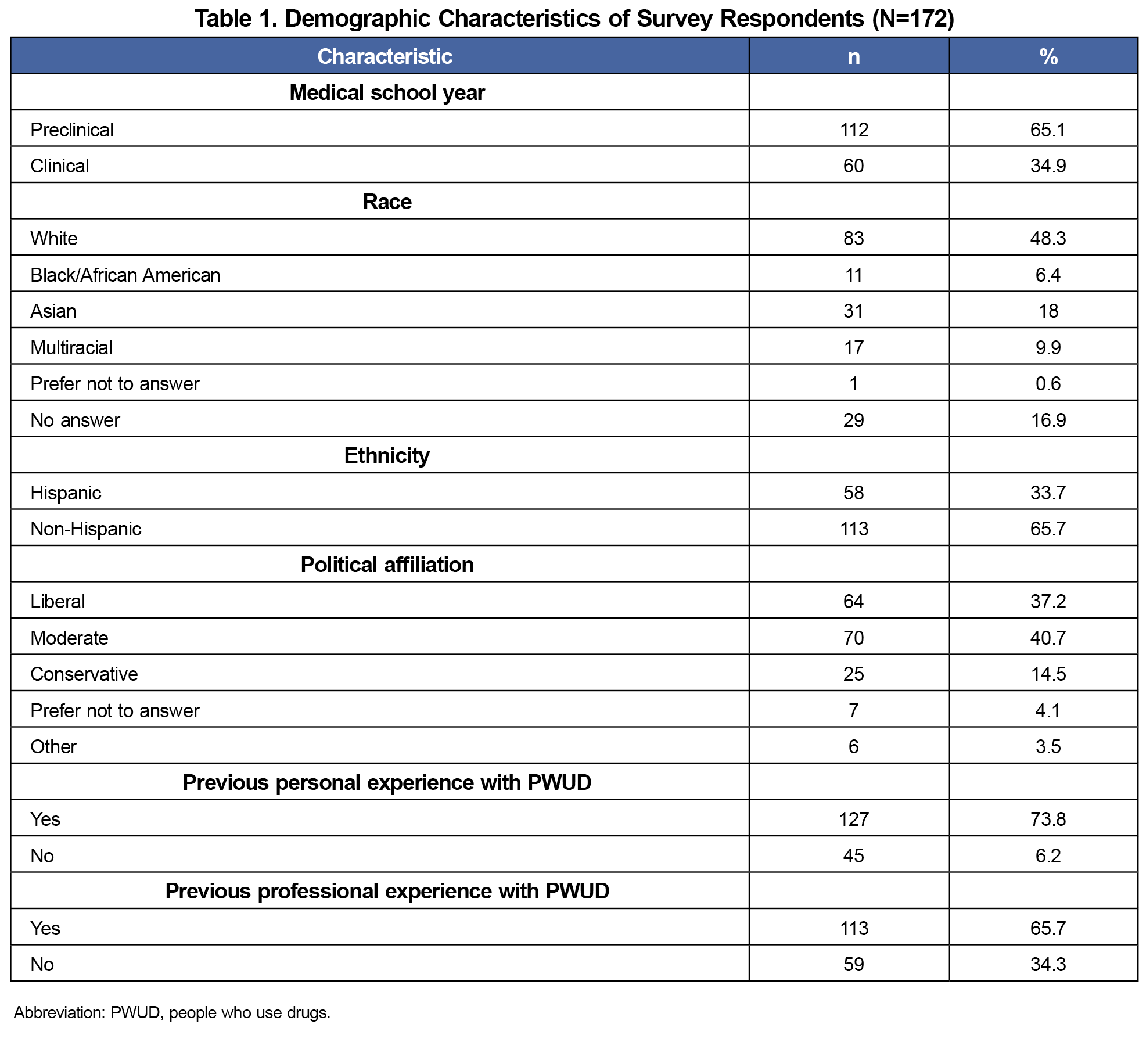 Of 496 medical students, 172 (34.7%) responded to all questions on the survey and were included in the analysis. Most students (65%) were in their preclinical years. Forty-eight percent identified as White and 33.7% as Hispanic. Most reported previous personal (74%) or professional (66%) experience with PWUD (Table 1).