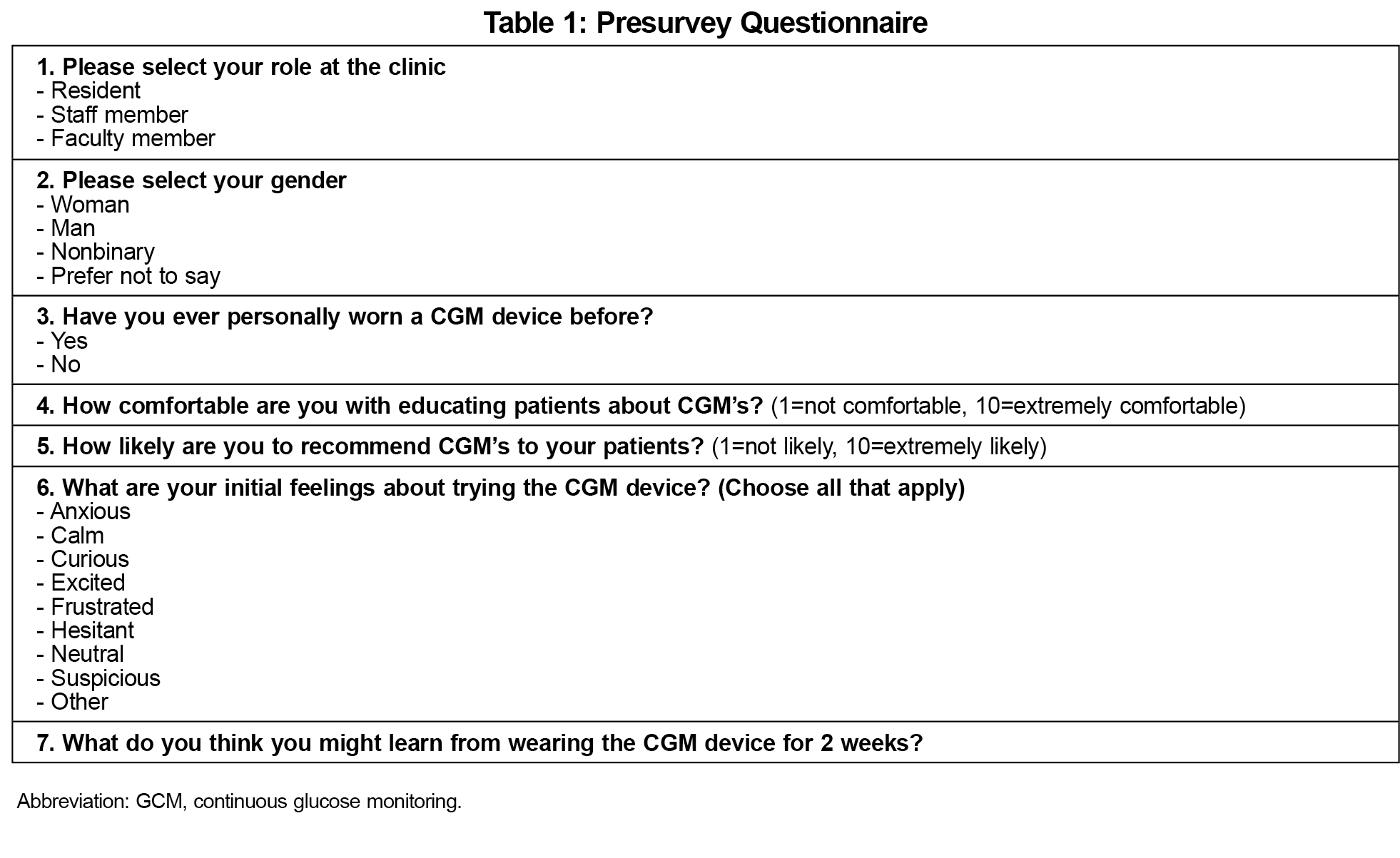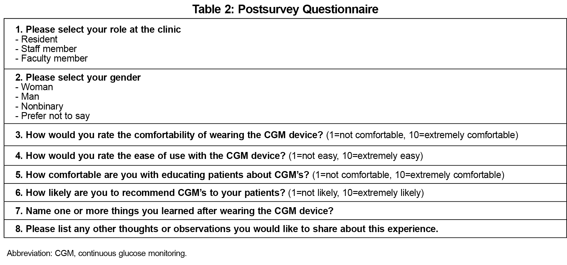 We developed a pre and postsurvey and distributed this to the participants (Tables 1 and 2). These brief 5-minute questionnaires asked about overall feelings towards the devices, perceived comfortability and understanding of CGMs, and likelihood to recommend to a patient before and after the workshops and trial periods. The pre and postsurveys were voluntary, anonymous, and completed online via Microsoft Forms. We used descriptive statistics to analyze survey results.