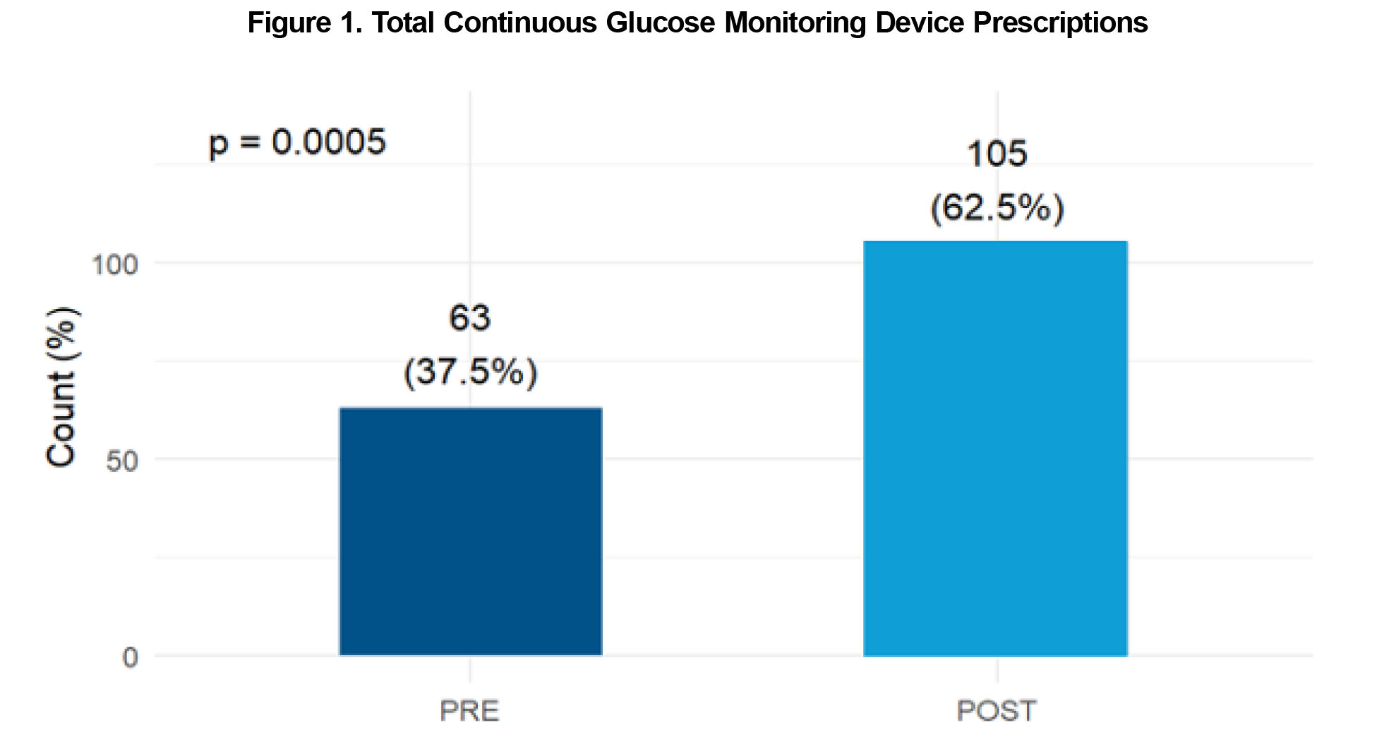 A total of 168 CGM prescription orders were placed during the study period. Of those, 40 orders (24%) were entered by a faculty physician or faculty pharmacist and 128 orders (76%) were placed by a resident physician or resident pharmacist. Following the hands-on CGM workshops, there was a significant increase in CGM orders across all prescriber groups, with 105 orders placed post-intervention compared to 63 orders preintervention (P<.05). Notably, residents in both family medicine and pharmacy demonstrated a significant increase in CGM prescribing after the intervention (P=.0005; Figure 1). No significant difference was observed in the choice of CGM device prescribed within the cohort (P=.415).