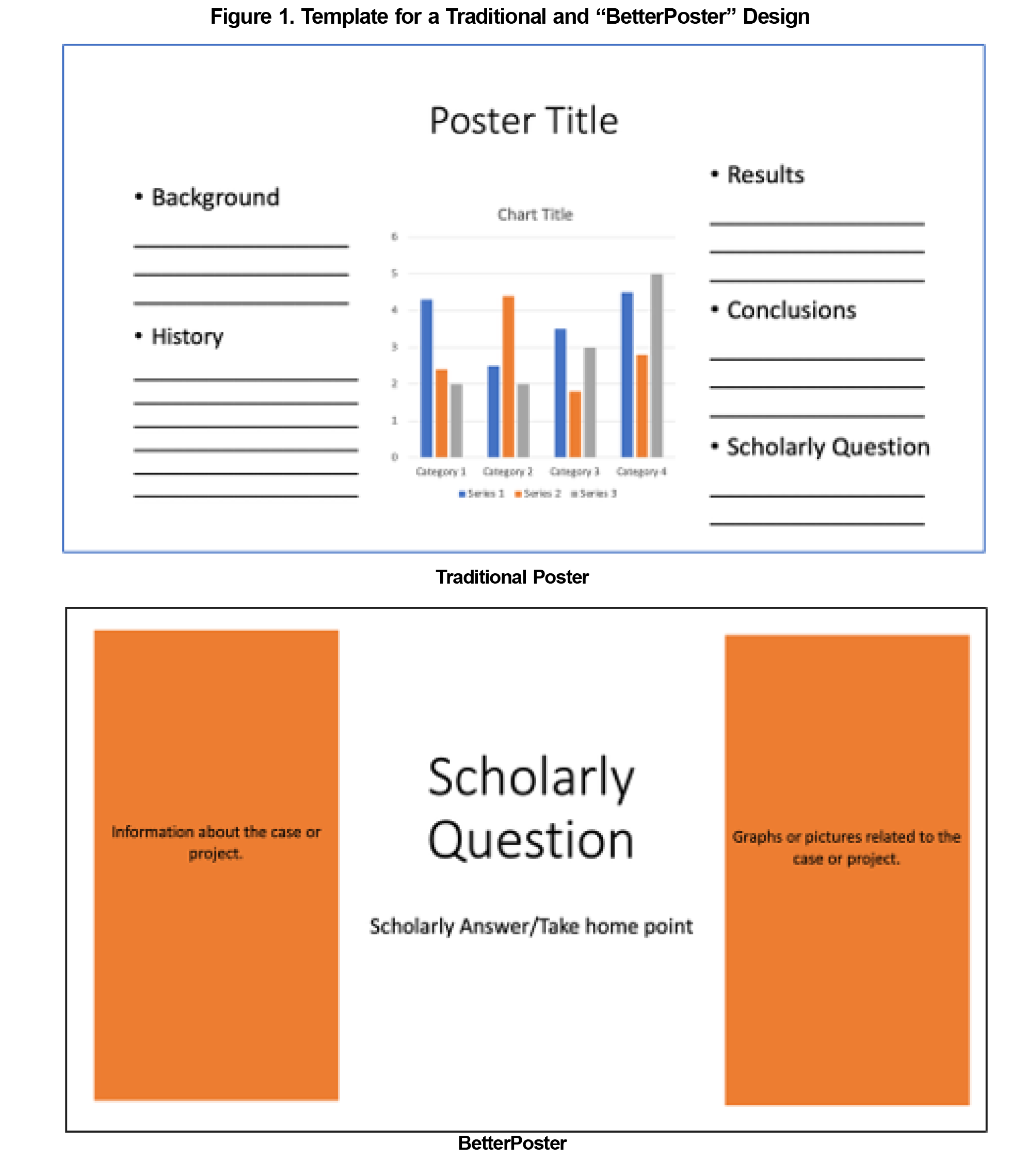 The academic poster is a popular format for disseminating clinical knowledge. The traditional poster design is predominantly used to present information (Figure 1). The traditional poster design is characterized by ample charts and graphs while mirroring the configuration of a written publication.1-3 However, this design often leads to dense text blocks, a cluttered appearance, and even omission of important information to increase aesthetic appeal.1-3