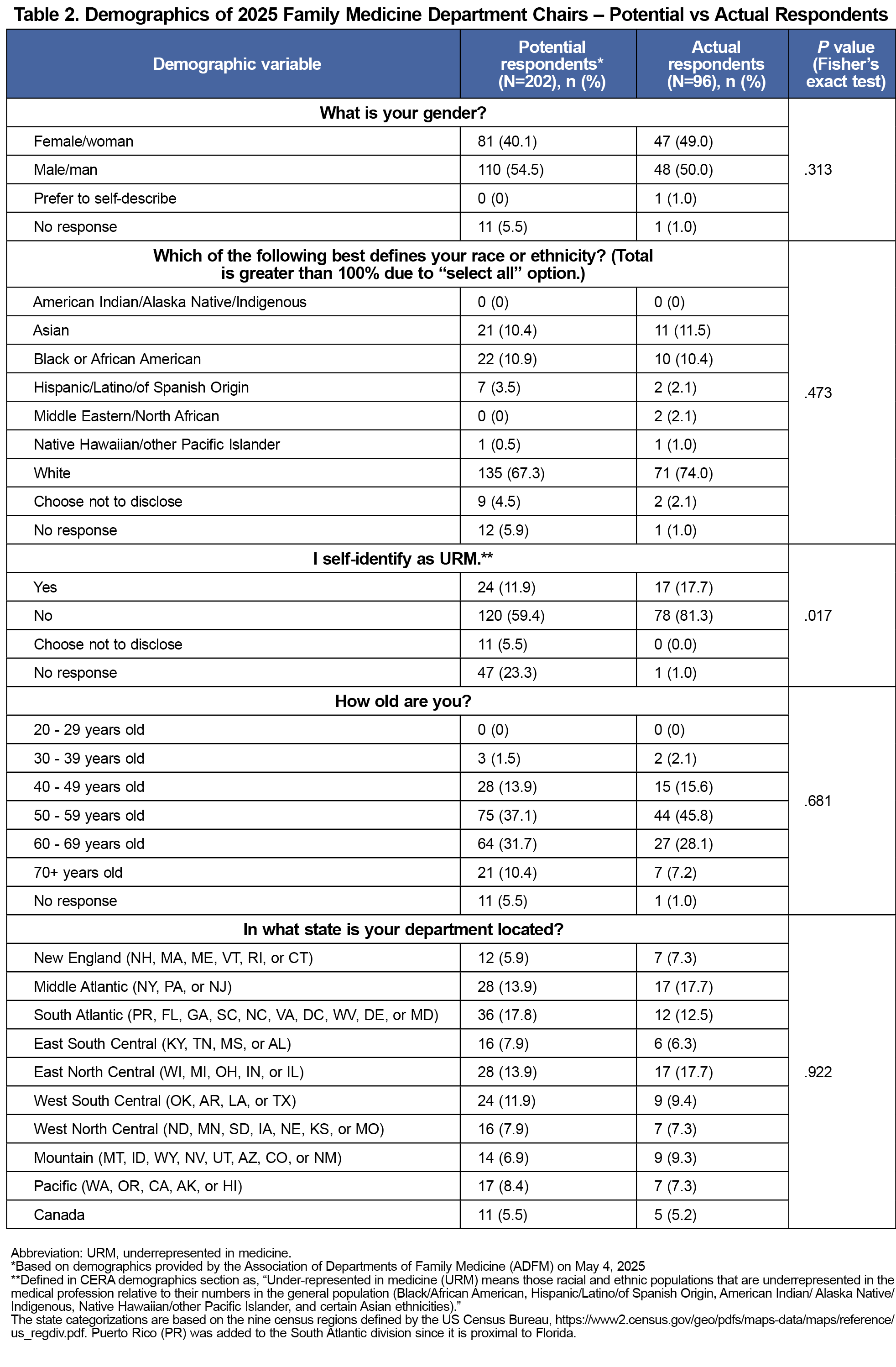 Out of 210 department chairs invited, 97 responded. We excluded one incomplete response, resulting in 96 usable responses and an overall response rate of 45.7% (96/210). No significant differences were found for gender, race/ethnicity, age, or location; however, self-identification as URM differed significantly between groups (Table 2).
